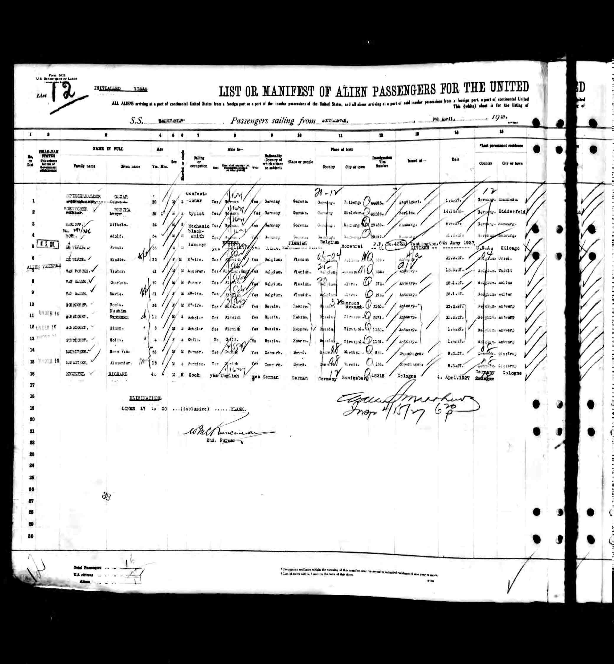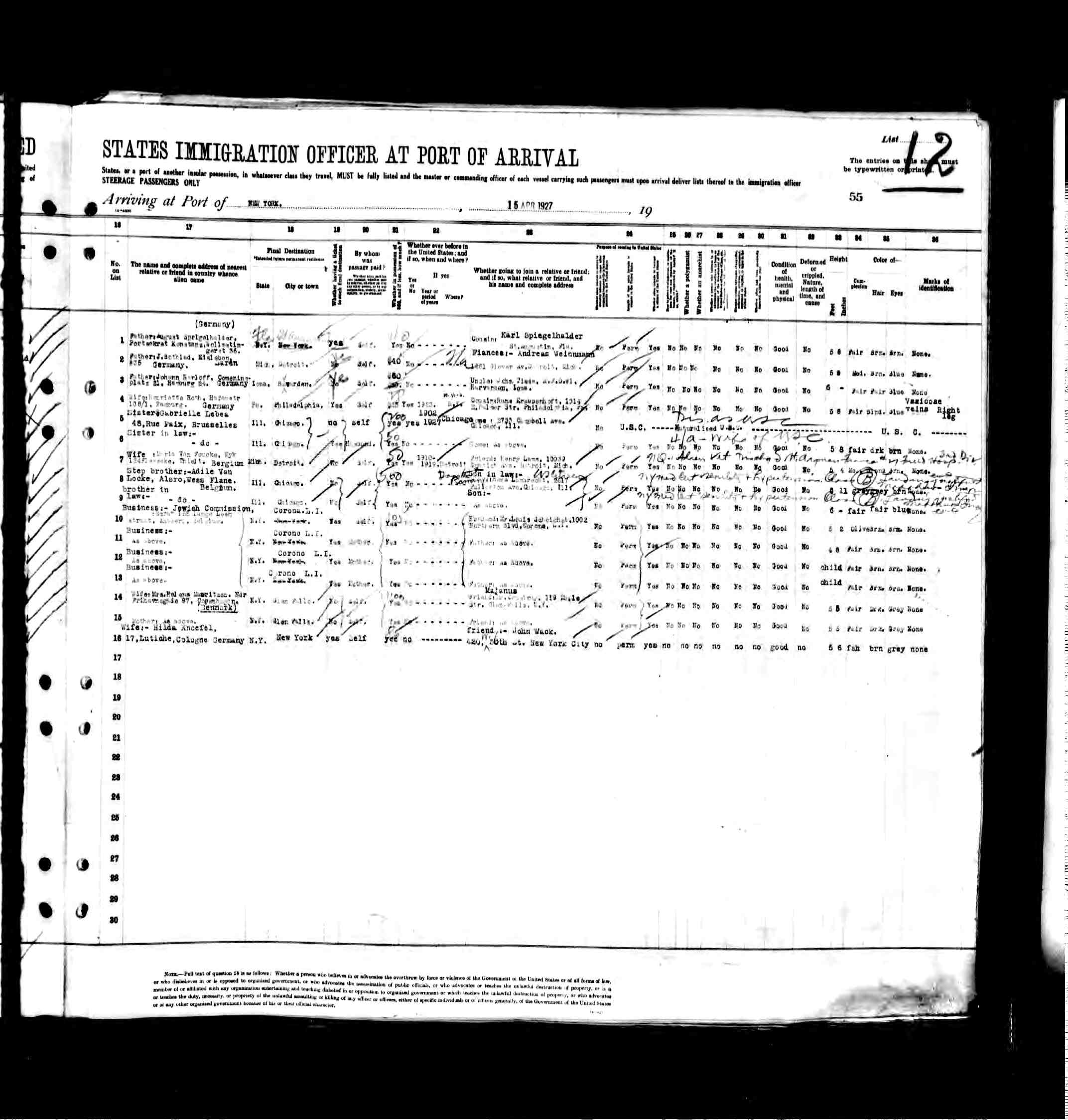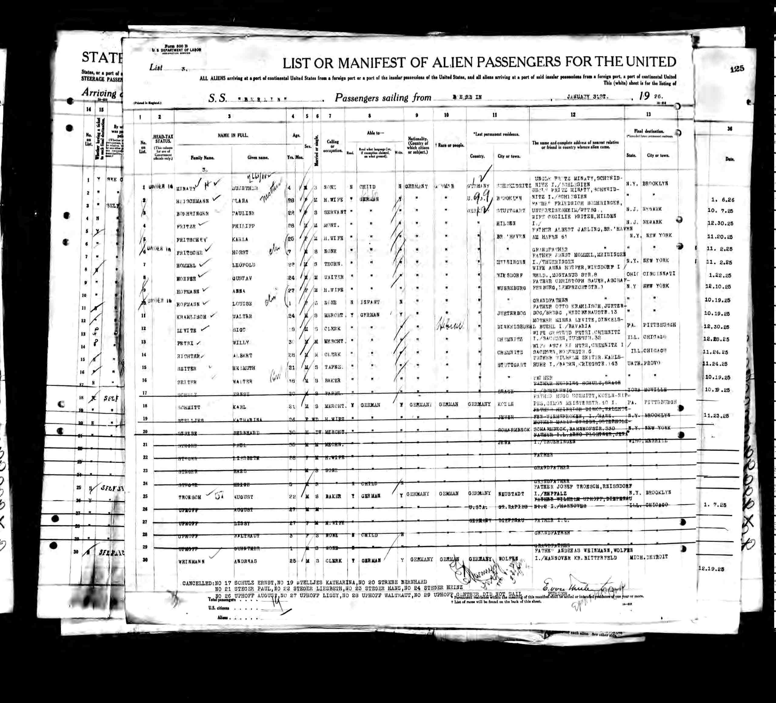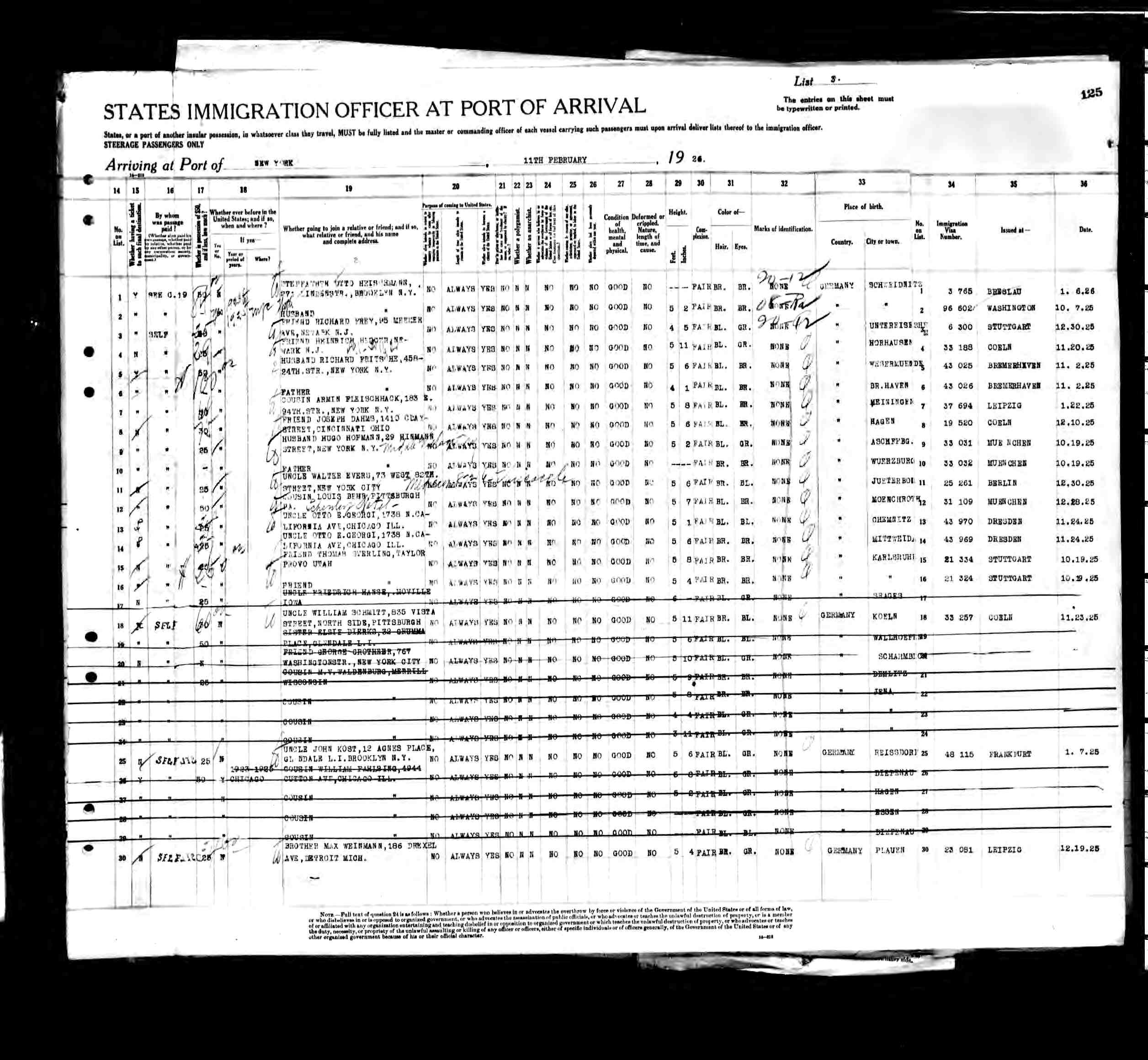 Andreas Weinmann listing, S.S. Bremen passenger listing, February 11, 1926 (Page 1)(Page 2) and Bertha Boettcher listing, S.S. Aquitania passenger listing, April 16, 1927 (Page 1)(Page 2), Ship Passenger Lists for the Port of New York, Record Group 85 – Records of the Immigration and Naturalization Service, National Archives and Records Administration, Washington, DC; available as NARA Microfilm Publication T715. Other documents show Andreas' eye color as hazel and family members remember his eyes as being blue.