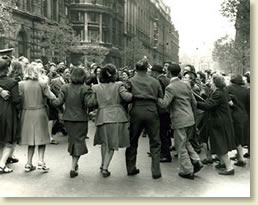 | The royal family was to appear on the palace balcony somewhat later, but I wanted to catch the late afternoon train back to Barry. Having allowed myself an hour to get to Paddington Station, I collected my belongings from the service club and went to the Piccadilly Circus Underground station. To my dismay, it was closed because of the crowds. I hurried to the nearest alternative several blocks away. From there it was possible to get to Paddington by an indirect route involving a transfer. The trains moved at a snail's pace, and by the time I reached the station, my train had been gone for 15 minutes. | |