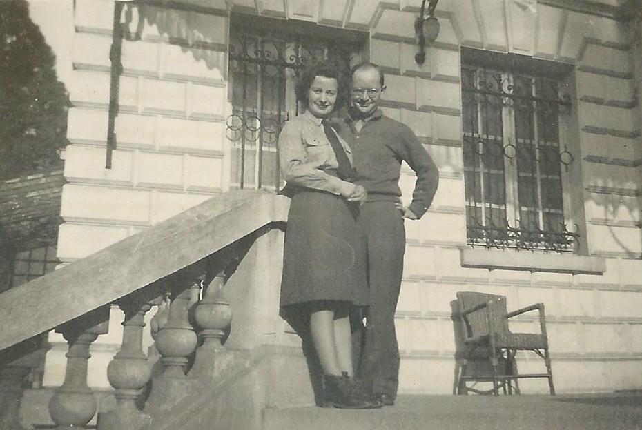 Photographs of Mom and Dad on the steps of the building at Versailles where he worked. |