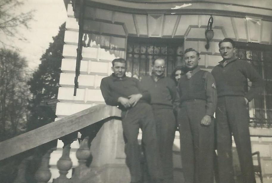 Dad and friends on the steps of the building at Versailles in which they worked. |