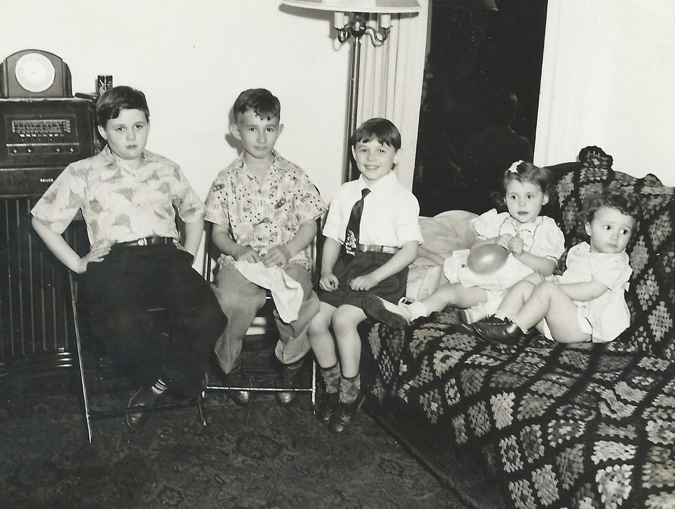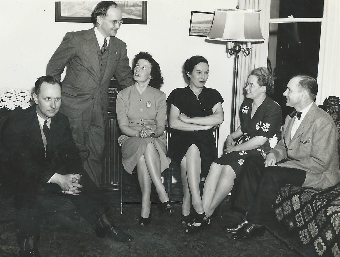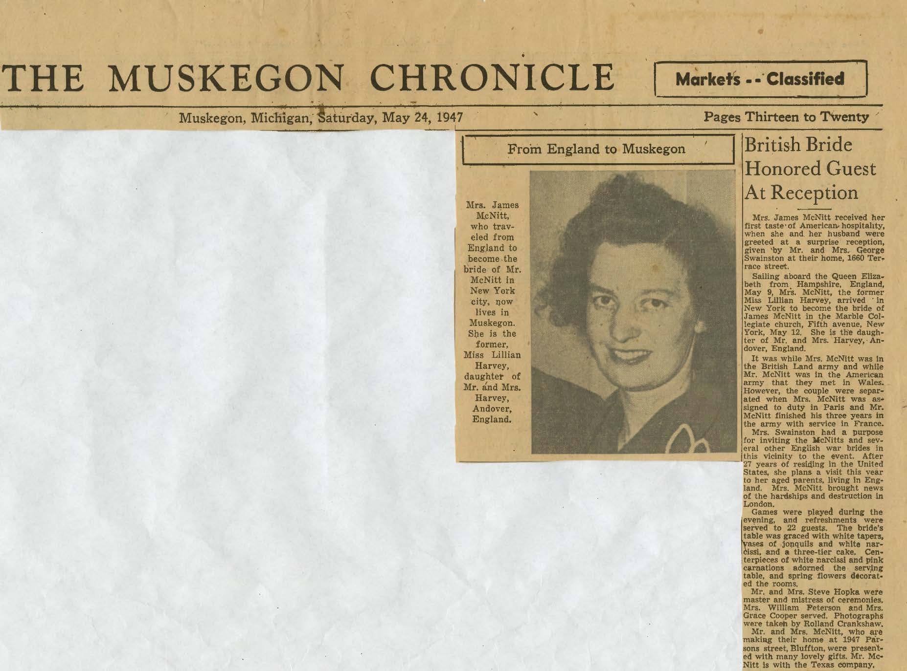 Wedding reception for the newlyweds at the Aunts' house (107 Logan SE, Grand Rapids) soon after their arrival in Michigan. The third photograph shows Dad's brother Walter, Dad, Mom, Catherine (Walter's wife), Cecile (Glenn's wife), and Dad's brother Glenn. The fourth shows the McNitt nephews and nieces at the reception - Glenn, Walt, Ted, Kay,and Charlene. Newspaper story about a reception hnoring Mom held in Muskegon attended by several other British war brides. In reading the article, please note that Mrs. Swainston has the story of how Dad and Mom met incorrect - they met in France, not in Wales. |