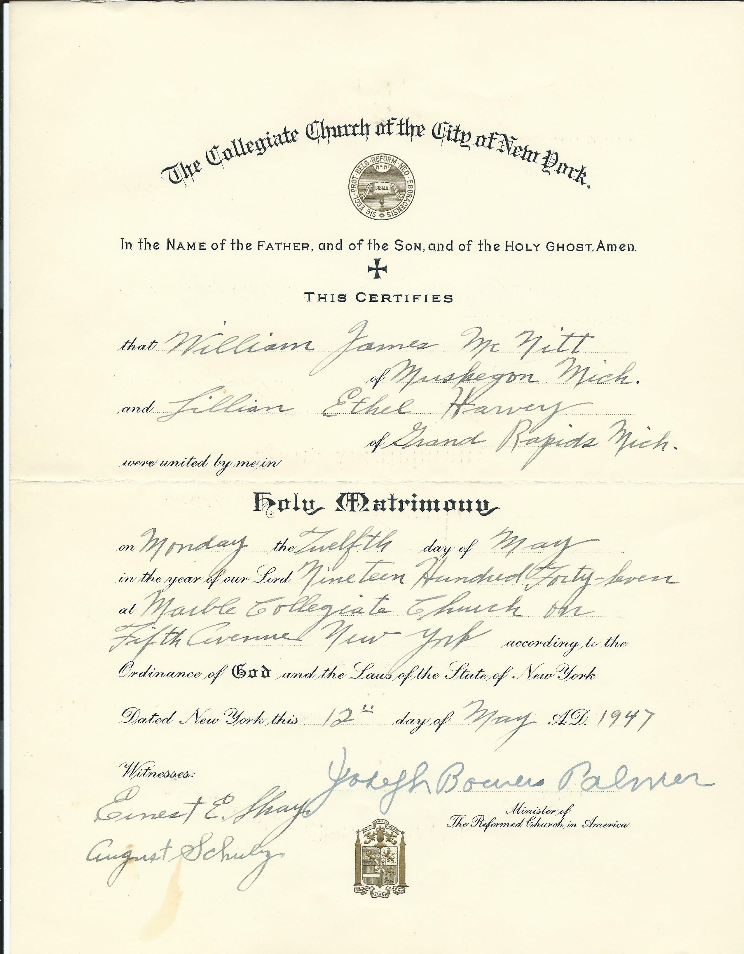 | There would be a mandatory 72-hour waiting period before we could be married, which would make it Tuesday at the earliest. We started looking around for a place in which the nuptials could be performed. First we went to an Episcopal church usually referred to as The Little Church Around The Corner. It had ties to the world of the theater; many well-known actors and actresses had been married there. Rev. Randolph Ray let us down gently, explaining that my divorce prevented our marriage there. He had been forced to refuse to marry his own daughter for the same reason. | |