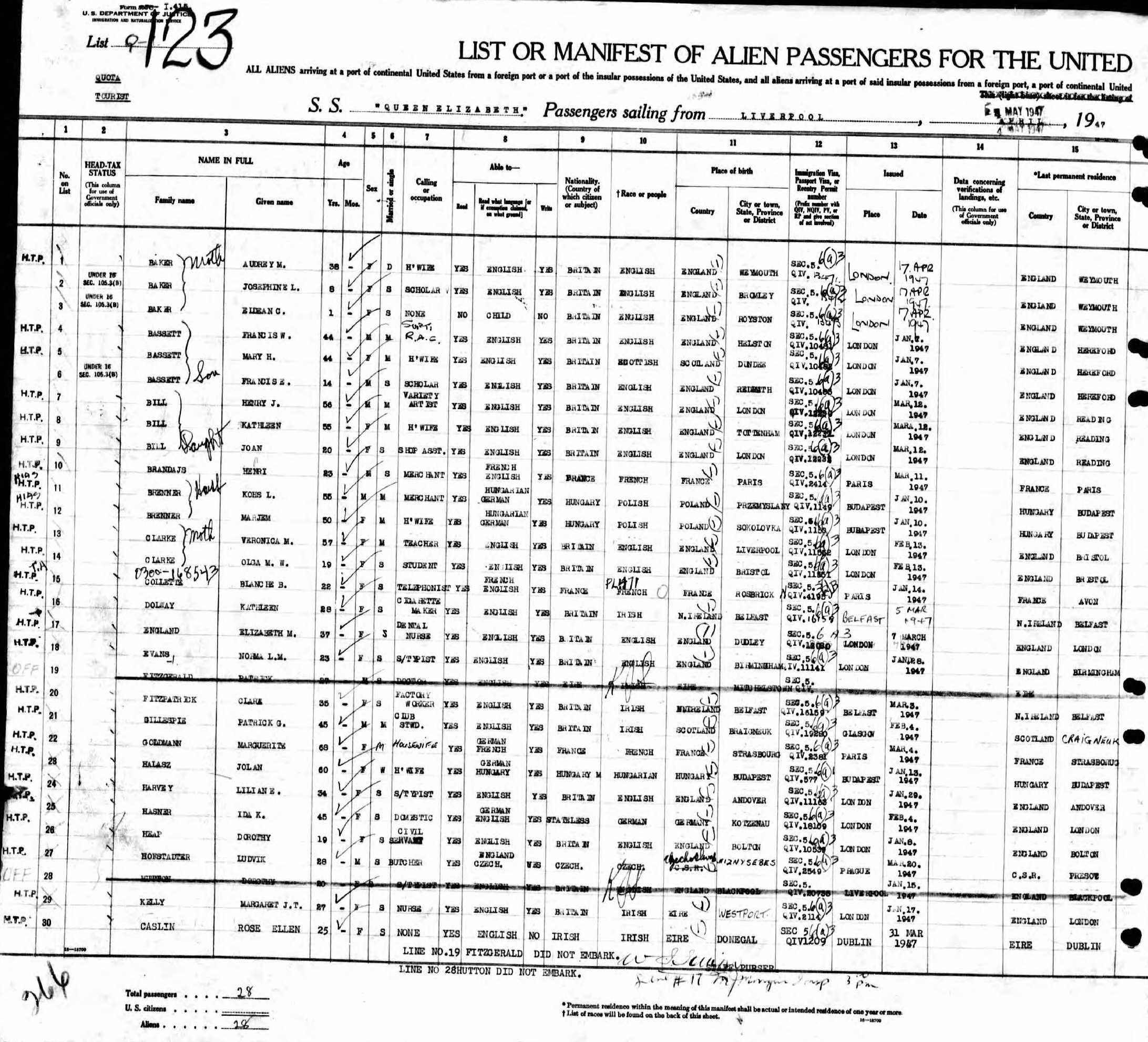 S.S. Queen Elizabeth; passenger list showing Lilian Harvey |