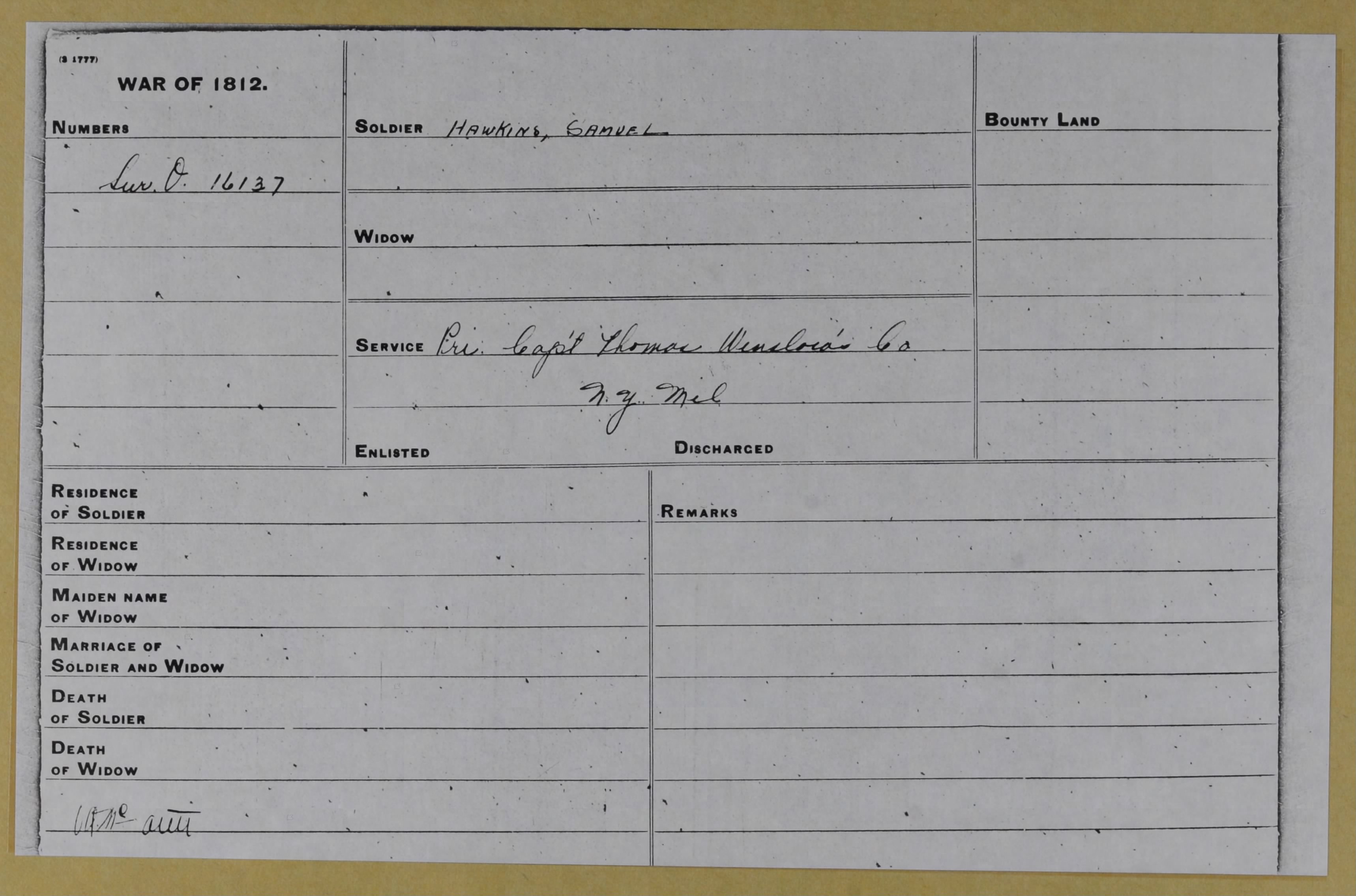 Around 1860, the state of New York decided to retroactively reimburse War of 1812 militia members for the cost of arms and clothing that they had brought from home. Joseph Bullen filed a claim for $58.50 and Samuel Hawkins filed one for $12.